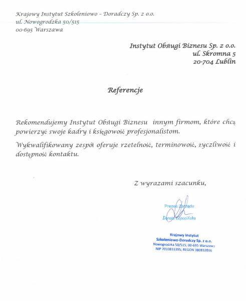 Instytut Obsługi Biznesu Sp. z o.o. powstał w oparciu o wieloletnie doświadczenie zespołu w pracy biurowej i zarządzaniu finansami. Profil działalności skierowany jest na kompleksową obsługę outsourcingowych procesów biznesowych w zakresie usług finansowo-księgowych, kadrowo-płacowych oraz innych usług związanych z pracą biurową przedsiębiorstw. Posiadamy wszelkie uprawnienia do usługowego prowadzenia ksiąg rachunkowych. Prowadzimy księgowość zgodnie z Ustawą o rachunkowości z dnia 29 września 1994 roku.